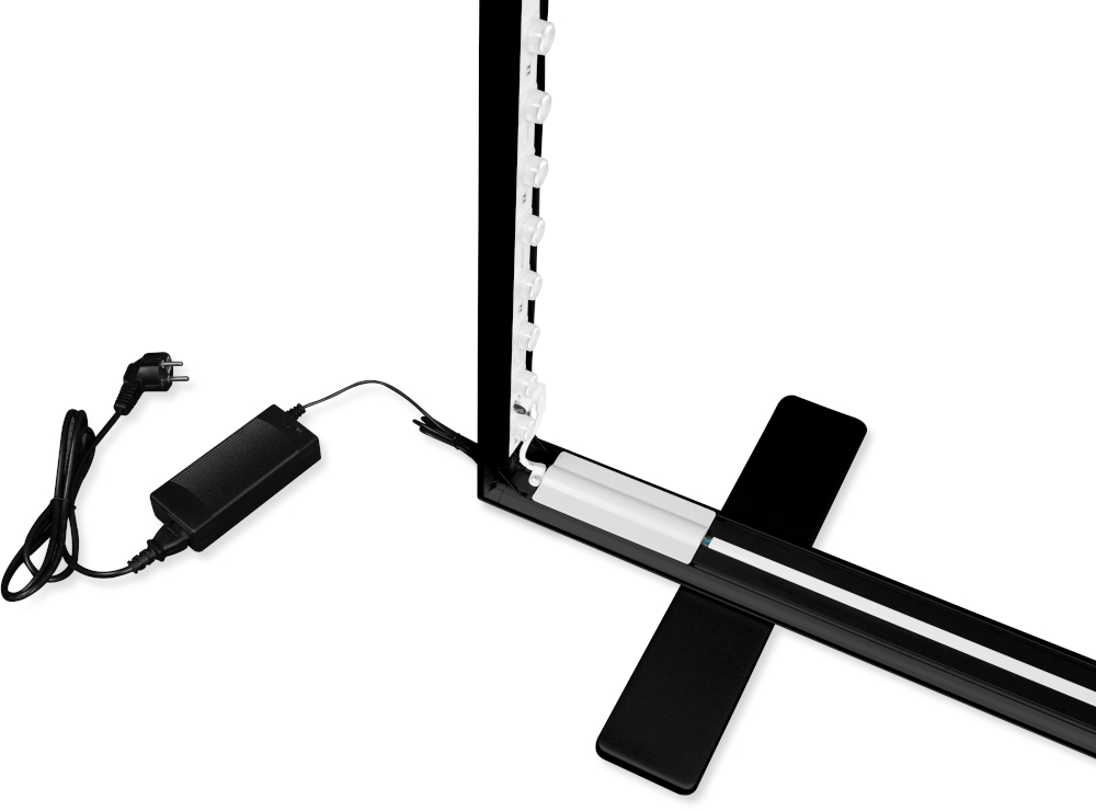 Kilkadziesiąt wmontowanych żarówek LED gwarantuje niesamowity efekt prezentowanej grafiki. Montaż wydruku za pomocą taśmy silikonowej zajmuje dosłownie kilka sekund. Składane nogi oraz solidna, aluminiowa konstrukcja zapewniają stabilność, wysoką jakość oraz długi czas użytkowania produktu. Niewielkie rozmiary po złożeniu oraz walizka z grubego kartonu ułatwiają transport i przechowywanie całego systemu.