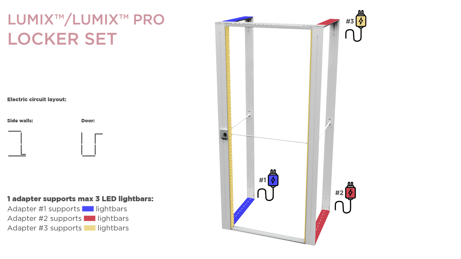 Zestaw zawiera: Locker set (skrzydło drzwi – 1 szt., system LUMIX™ 100×250 – 2 szt.) z zasilaczami (3 szt.), konektor T – 1 zestaw, konektor 90° – 3 szt., łącznik narożnikowy dolny – 1 szt., torbę transportową na kółkach (2 szt.). Wszystkie elementy zostały zapakowane w 3 kartony (49×34×135 cm + 47x32x132 cm+ 20x25x15 cm).