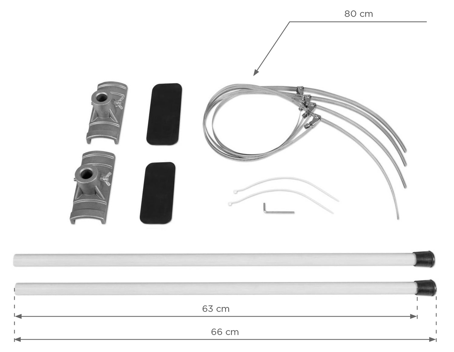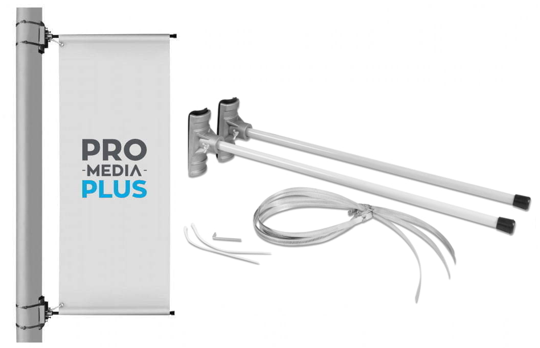Zestaw zawiera: Maszt górny i dolny, obejmy (4 szt.), podkłady gumowe (2 szt.), zipy do zabezpieczenia flagi/banera.