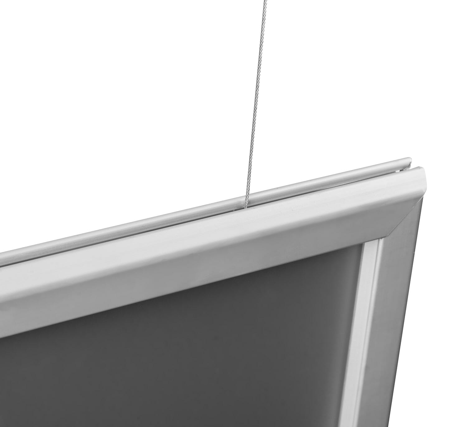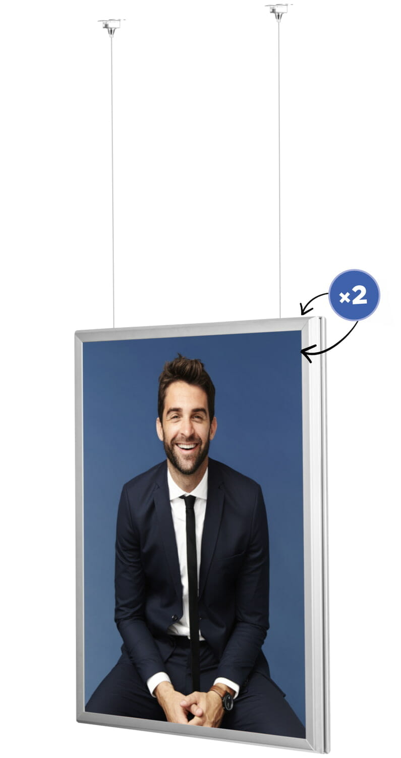 Doskonałe rozwiązanie dla sklepów wielkopowierzchniowych i centrów handlowych. Podwieszana ramka typu Premium, pozwoli na prezentację grafiki obustronnie. System „clip-clap” to błyskawiczna i bezproblemowa wymiana plakatu, która zabiera kilka sekund. Mocna, stalowa linka gwarantuje bezpieczne i stabilne podwieszenie ramki. W zestawie znajdują się uchwyty do montażu ramki na suficie.