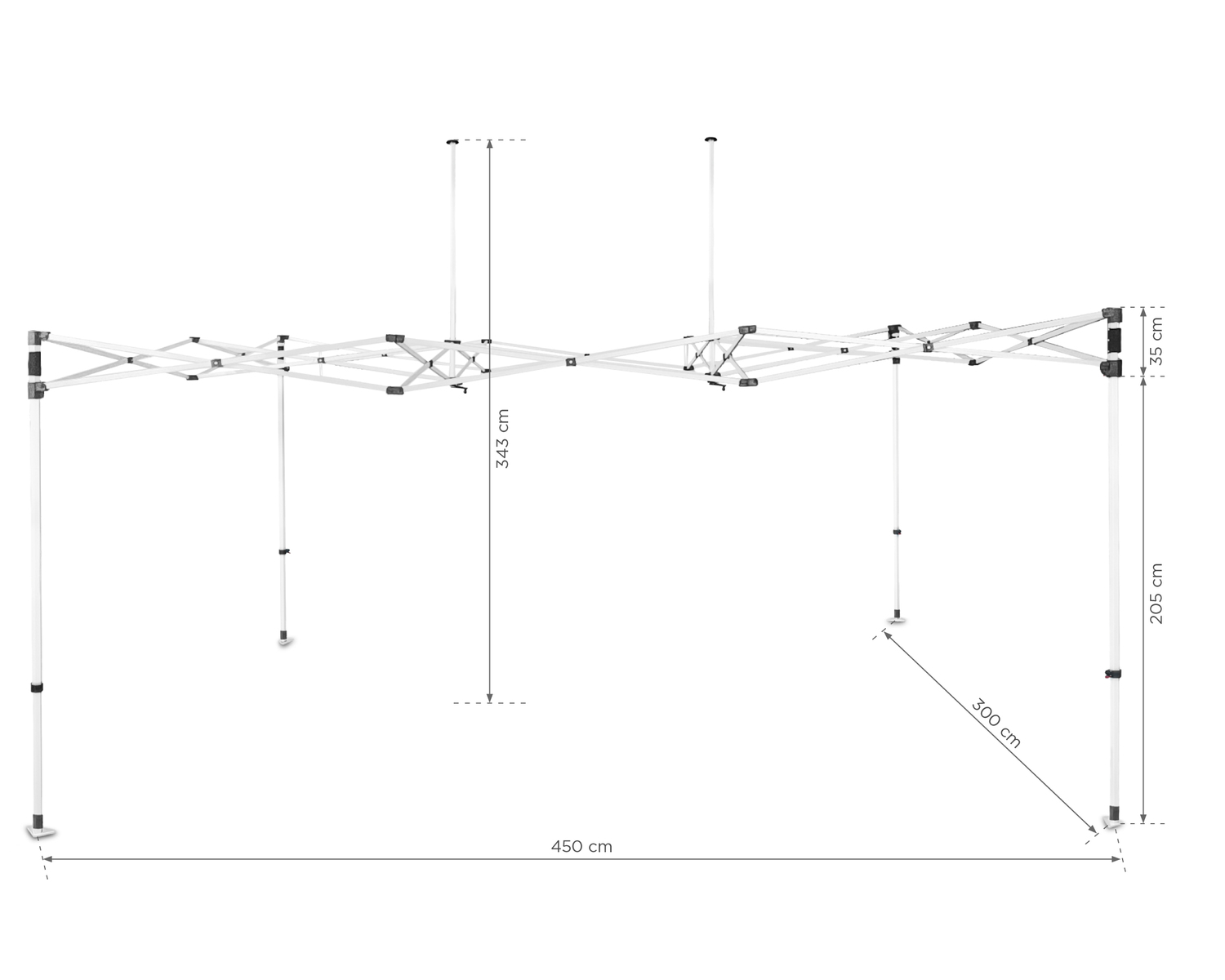 Zestaw zawiera: składany stelaż namiotu, akcesoria montażowe (4 szpilki, 4 linki o długości 3,3 m), torbę transportową na kółkach.