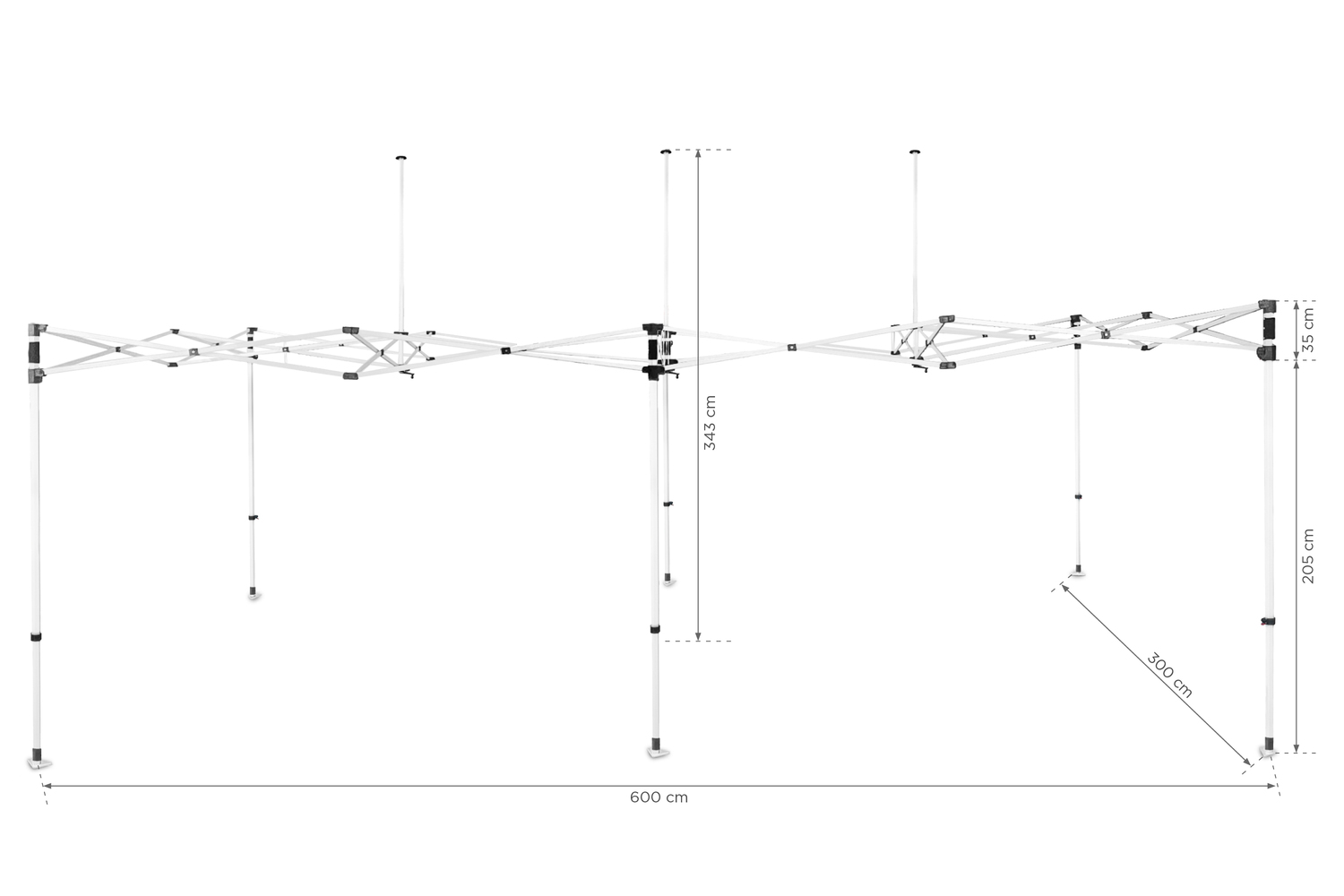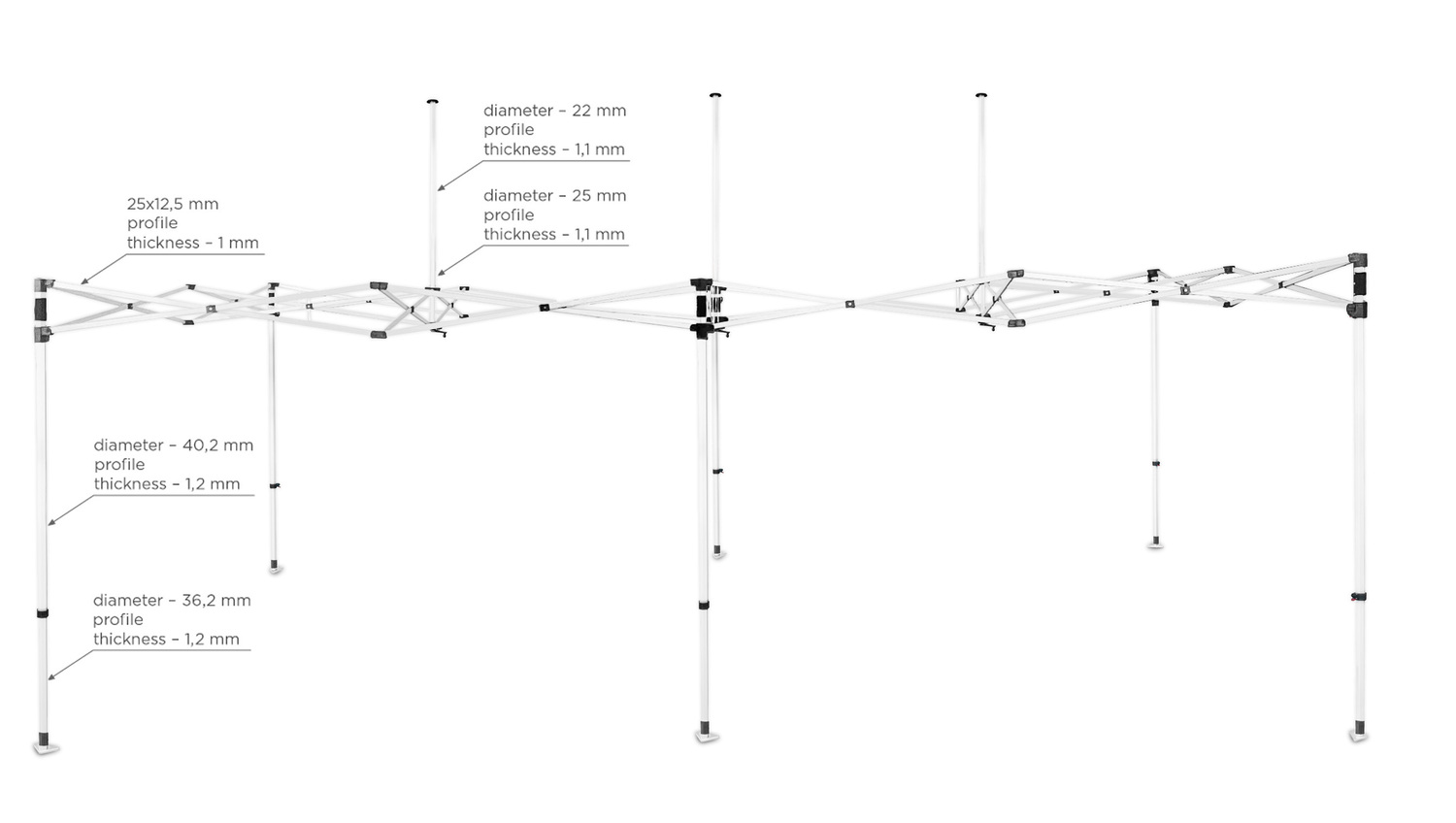 Zestaw zawiera: składany stelaż namiotu, akcesoria montażowe (6 szpilki, 6 linek o długości 3,3 m), torbę transportową na kółkach.