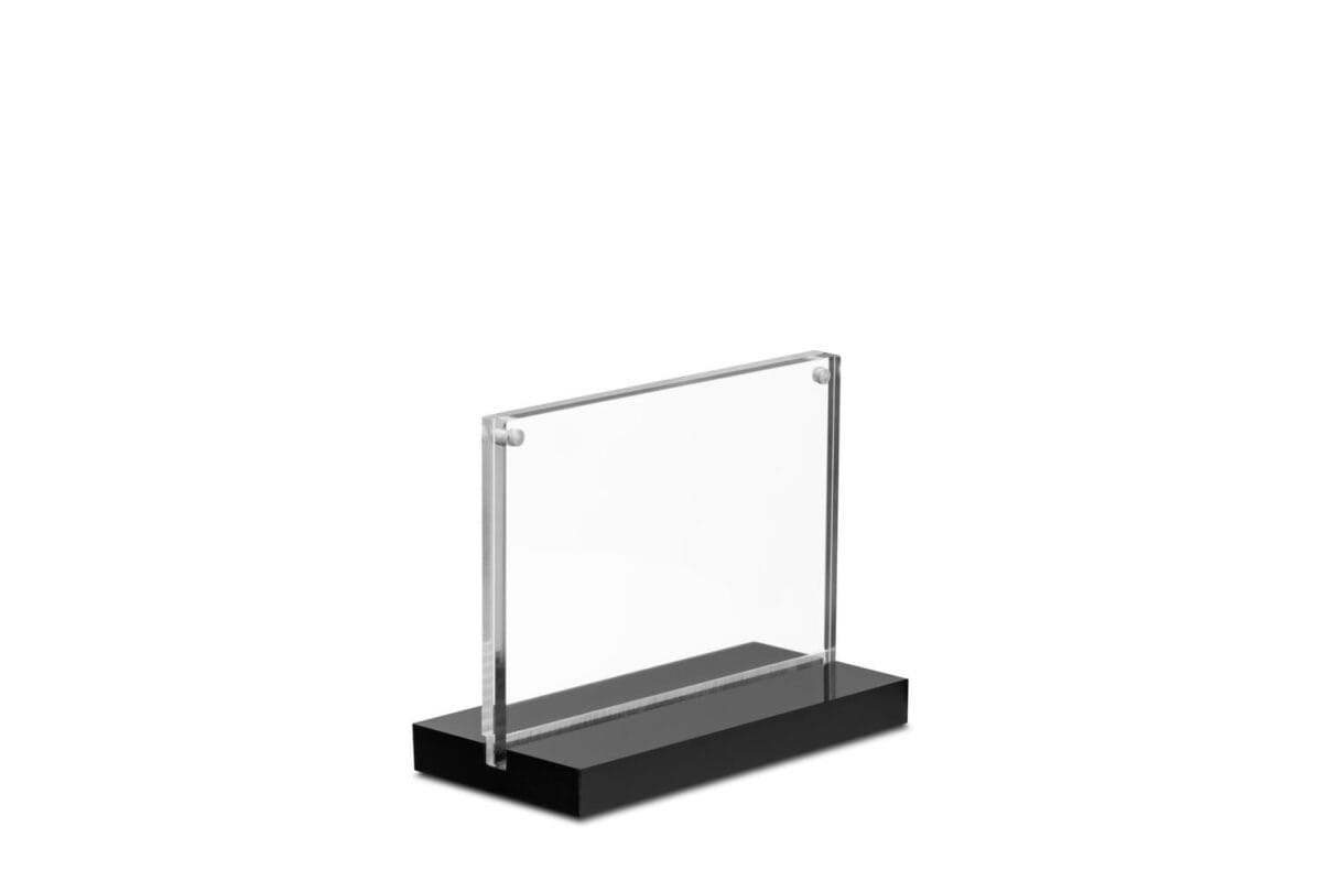 Elegancki, dwustronny stojak akrylowy. Szeroka czarna podstawa zapewnia stylowy wygląd i stabilność produktu. Wymiana grafiki odbywa się poprzez jej włożenie pomiędzy dwa magnetyczne panele i zajmuje dosłownie kilka sekund. Stojak ten idealnie sprawdzi się w miejscach przestrzeni publicznej, takich jak m.in. restauracje, banki czy hotele.