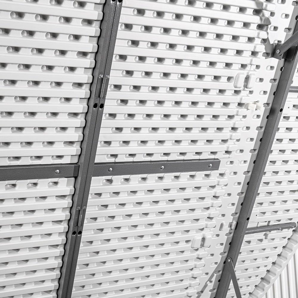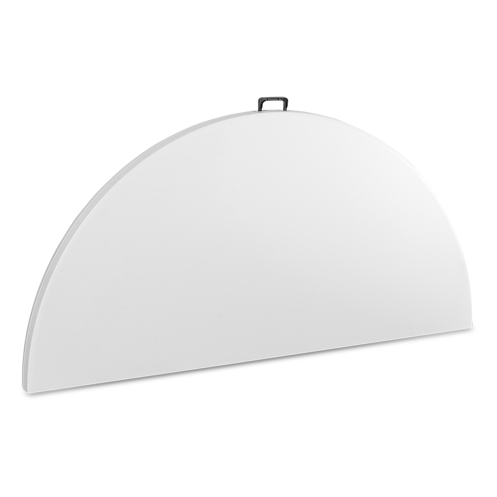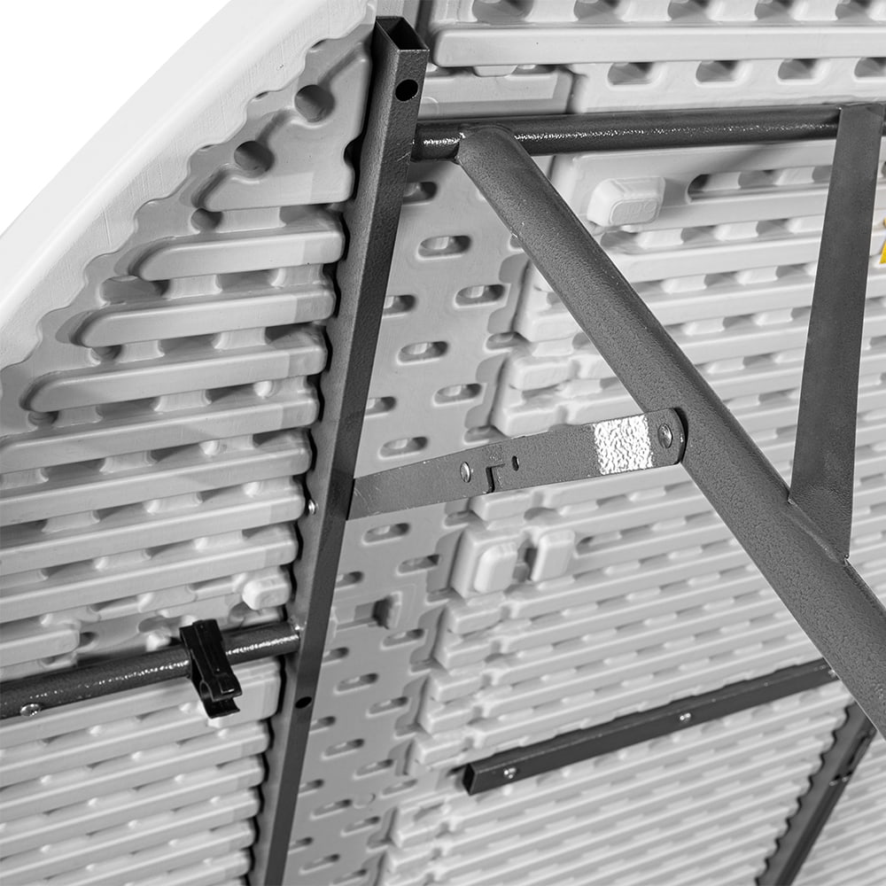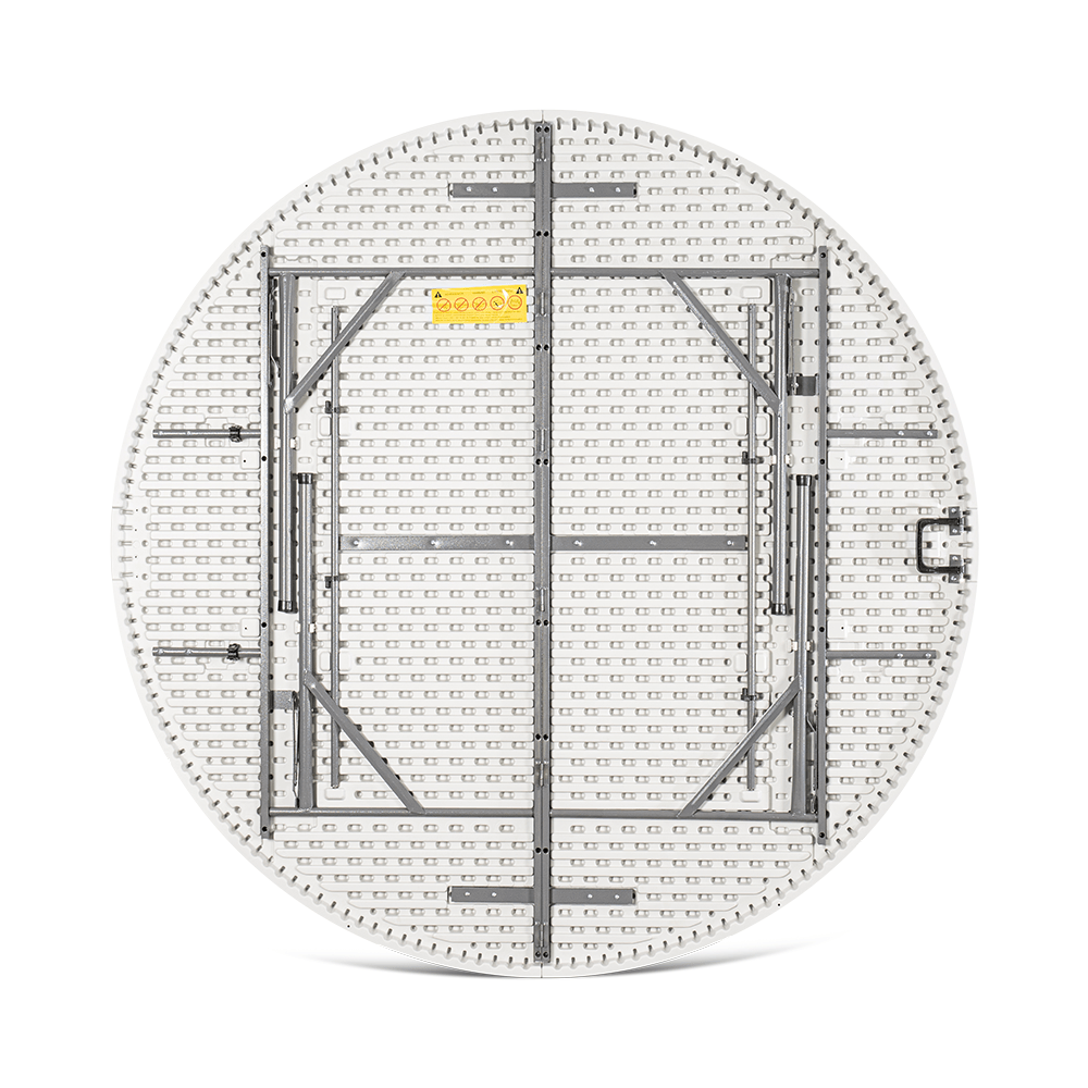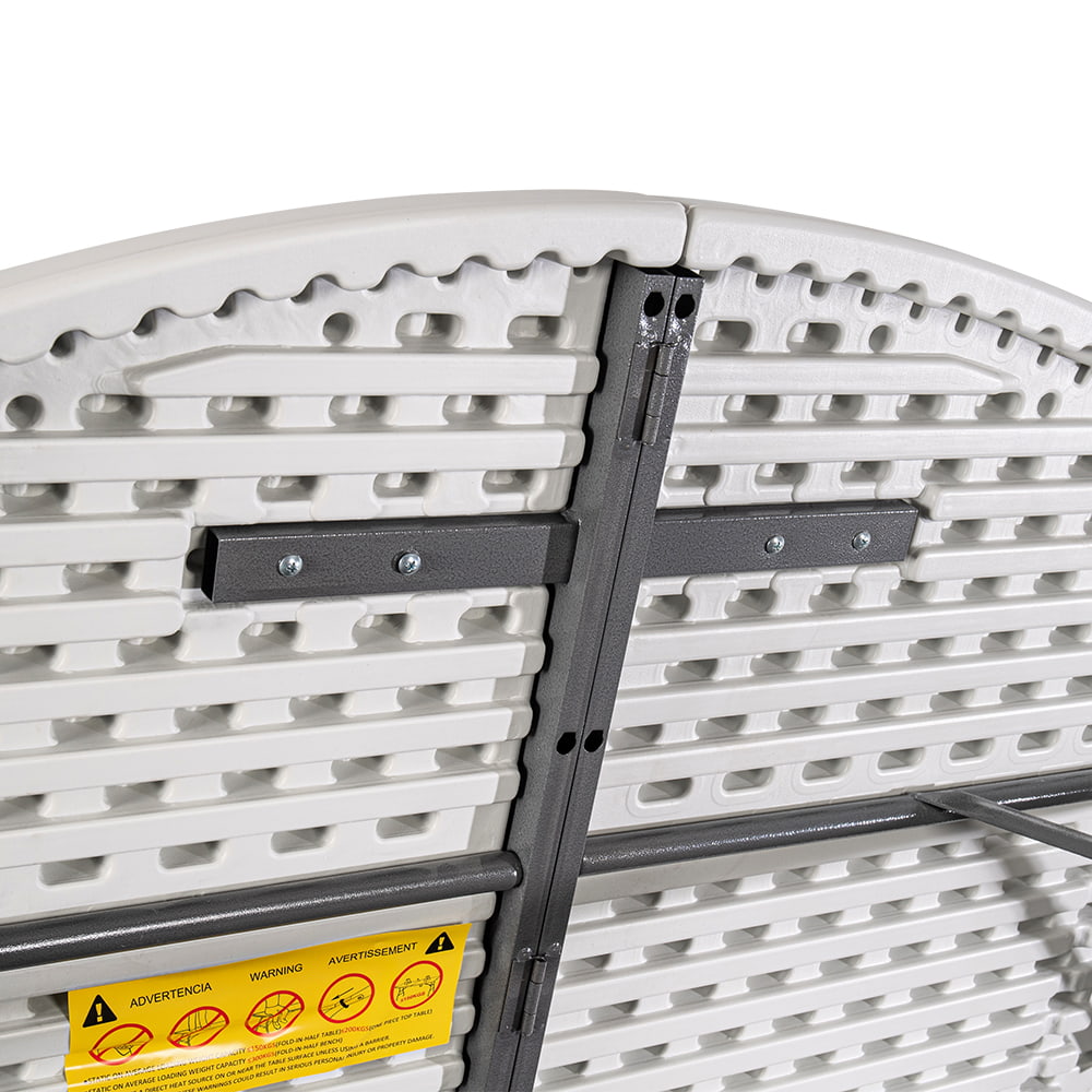 Blat o średnicy aż 183 cm został wykonany z bardzo trwałego polietylenu, a rama z mocnej stali pomalowanej metodą proszkową. Specjalna blokada zabezpiecza stół przed przypadkowym złożeniem, a gumowe nakładki na nóżkach przed zarysowaniem powierzchni. Pomimo sporych rozmiarów stół można w bardzo łatwy i szybki sposób złożyć, a specjalna rączka ułatwia jego przenoszenie.