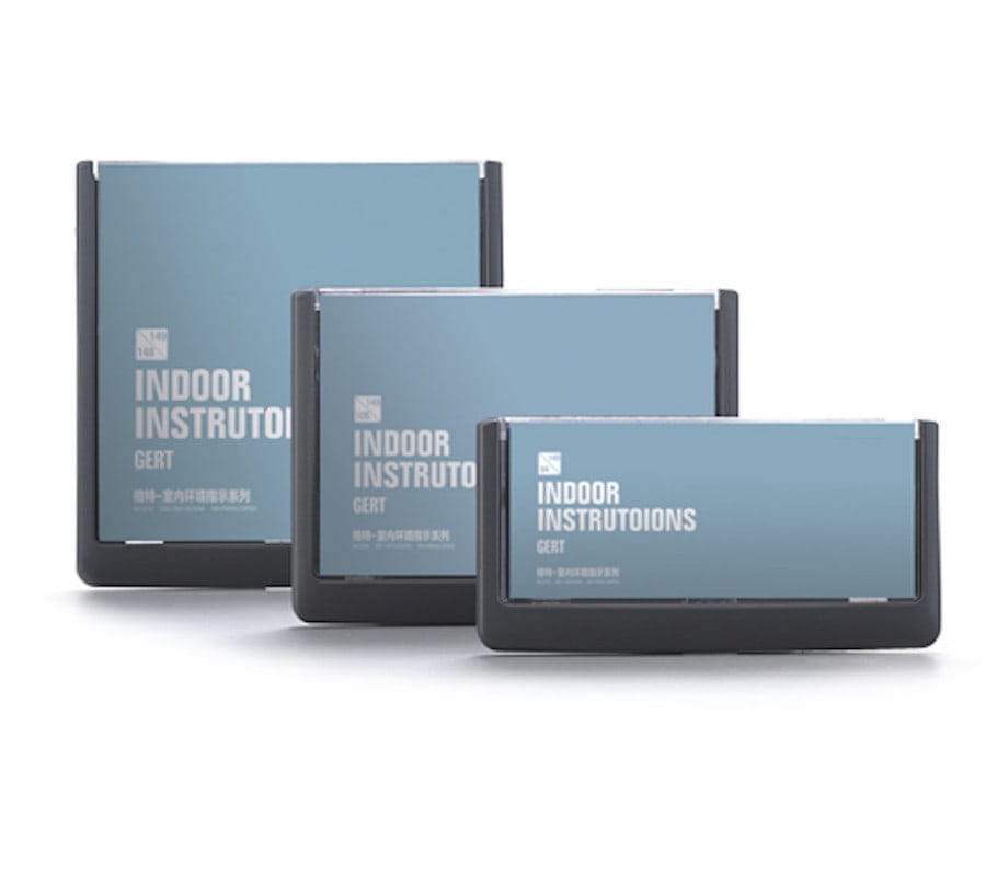 Gert to seria wyjątkowo eleganckich tabliczek o nowoczesnym wyglądzie i klasycznym, pasującym do wszystkich wnętrz, popielatym kolorze. Wymiana treści następuje poprzez otwarcie zatrzasków tabliczki, jednym ruchem, bez konieczności posiadania jakichkolwiek narzędzi.
