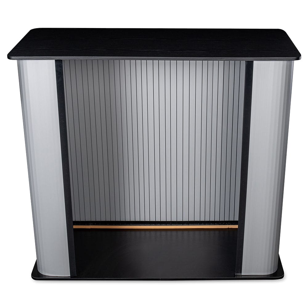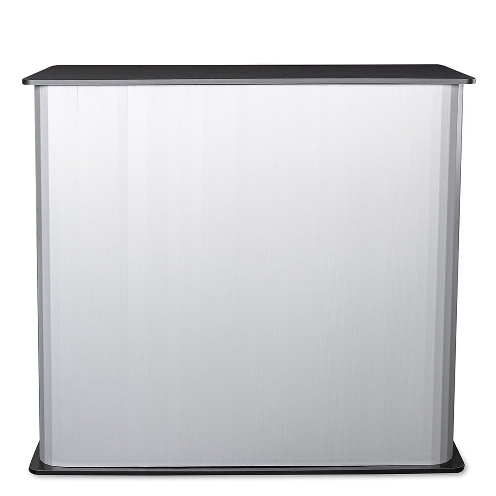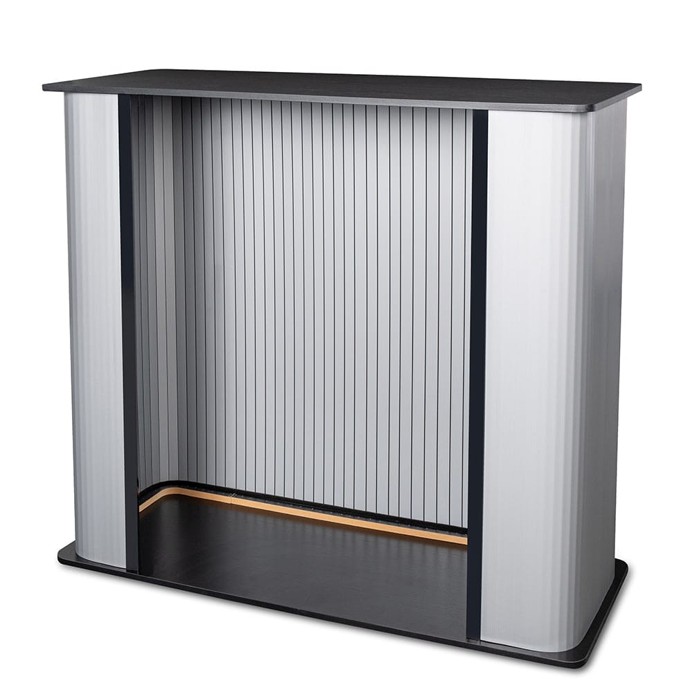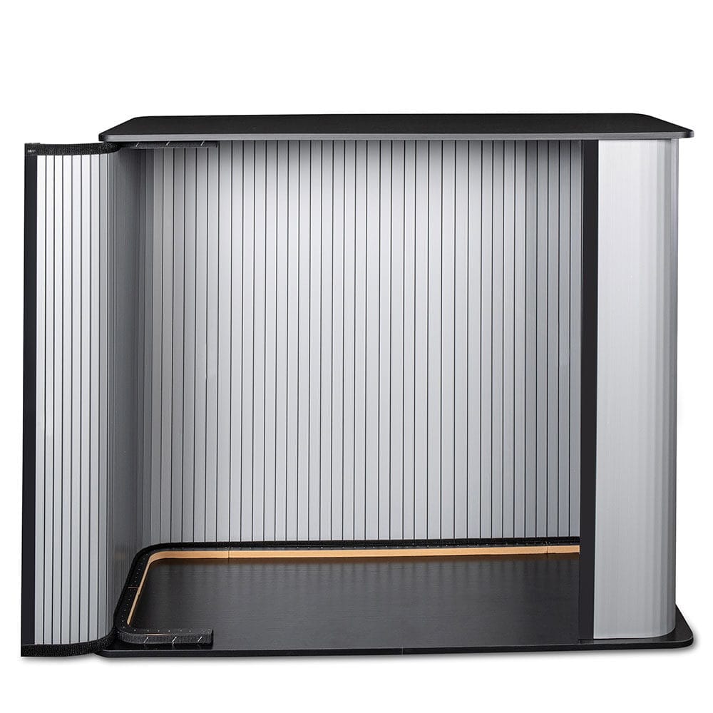 Ścianki tego systemu zostały wykonane z PVC komorowego, które montuje się do blatu i podstawy za pomocą rzepów. Dzięki tak prostej konstrukcji złożenie i rozłożenie trybunki nie wymaga użycia narzędzi i zajmuje dosłownie chwilę. Drewniana podstawa i mocny, drewniany blat gwarantują wysoką jakość, stabilność oraz długi czas użytkowania tego produktu.